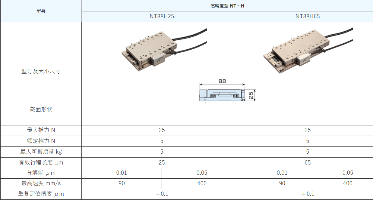 产品简介:NT…H是将圆柱滚子型的内置齿轨&齿轮型交叉滚子直线导轨用于工作台导向部,通过1μm以下的定位精度和行走直线度,实现高刚性和顺畅动作(无作用于空气静压轴承的脉动)的高精度直线电机工作台。